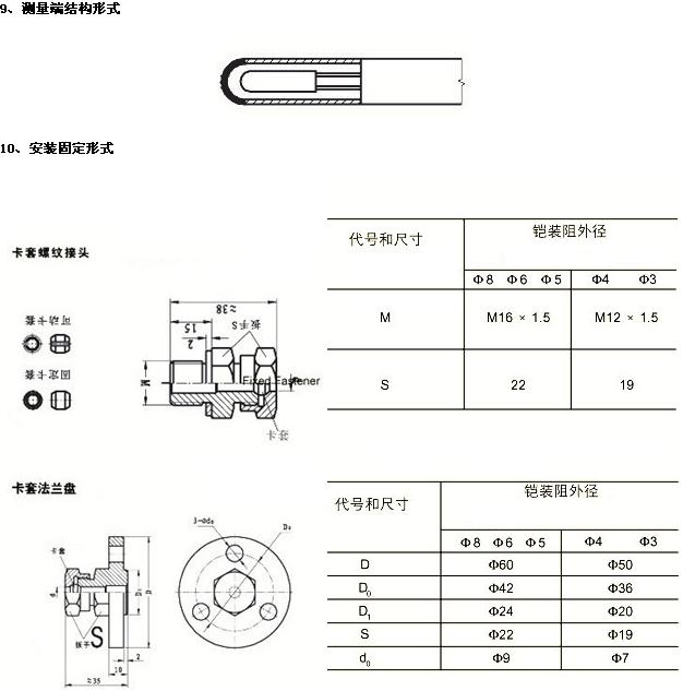 分度代號溫度范圍℃精度等級安裝固定裝置WZPK-133Pt100-200-+500A級或b級無固定裝置wzpk-134 wzpk-135 wzpk-136 wzpk-138 wzpk2- 135 wzpk2- 136 wzpk2- 138 wzpk-233固定螺紋件wzpk-134 k-238 wzpk2- 234 wzpk2- 235 wzpk2- 236 wzpk-238 wzpk-333可動鎖緊螺釘wzpk-335 wzpk-336 wzpk2- 335 wzpk2- 336 wzpk2- 338 wzpk-433固定鎖緊凸緣wzpk wzpk-438 wzpk2- 435 wzpk2- 436 wzpk2- 438 wzpk-533可動咬合凸緣wzpk-534 wzpk-535 wzpk-536 wzpk-538 wzpk2- 534 wzpk2- 535 wzpk2- 536 wzpk2- 5382 )防噴流式